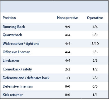 Twenty-eight (53%) of these athletes underwent nonoperative management, requiring at least 2 weeks of rest, and 25 (47%) of these athletes underwent operative intervention. In those who underwent nonoperative management, 21 (84%) were primarily offensive players and 7 (16%) were primarily defensive players. Four of the athletes (14%) were offensive/defensive lineman, while the remaining 24 athletes (86%) were non-lineman. In those who underwent operative management, 17 (68%) were primarily offensive players, 7 (28%) were primarily defensive players, and 1 (4%) was primarily a special-teams player. Three of the athletes (12%) were offensive/defensive lineman, while the remaining 22 athletes (88%) were non-lineman. In both groups, 68% of athletes can be characterized as skill positions (Table 1). Average age of athletes in the surgical group was 27 years (range 21 – 33) and the average age in the non-operative group was 27 (range 22 – 36).