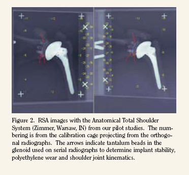 Wirth MA, Rockwood CA, Jr. Complications of total shoulder-replacement arthroplasty. J Bone Joint Surg Am 1996;78(4):603-16.Grammont PM, Baulot E. Delta shoulder prosthesis for rotator cuff rupture. Orthopedics 1993;16(1):65-8.Sirveaux F, Walch, G. Unpublished data presented at the American Shoulder and Elbow Society Annual Meeting, 2006;Torchia ME, Cofield RH, Settergren CR. Total shoulder arthroplasty with the Neer prosthesis: long-term results. J Shoulder Elbow Surg 1997;6(6):495-505.Sperling JW, Cofield RH, Rowland CM. Minimum fifteen-year follow-up of Neer hemiarthroplasty and total shoulder arthroplasty in patients aged fifty years or younger. J Shoulder Elbow Surg 2004;13(6):604-13.Cofield RH. Total shoulder arthroplasty with the Neer prosthesis. J Bone Joint Surg Am 1984;66(6):899-906.Lacroix D, Prendergast PJ. Stress analysis of glenoid component designs for shoulder arthroplasty. Proc Inst Mech Eng [H] 1997;211(6):467-74.Sperling JW, Cofield RH, Rowland CM. Neer hemiarthroplasty and Neer total shoulder arthroplasty in patients fifty years old or less. Long-term results. J Bone Joint Surg Am 1998;80(4):464-73.Skirving AP. Total shoulder arthroplasty -- current problems and possible solutions. J Orthop Sci 1999;4(1):42-53.Hopkins AR, Hansen UN, Amis AA, Emery R. The effects of glenoid component alignment variations on cement mantle stresses in total shoulder arthroplasty. J Shoulder Elbow Surg 2004;13(6):668-75.Severt R, Thomas BJ, Tsenter MJ, Amstutz HC, Kabo JM. The influence of conformity and constraint on translational forces and frictional torque in total shoulder arthroplasty. Clin Orthop Relat Res 1993(292):151-8.Brenner BC, Ferlic DC, Clayton ML, Dennis DA. Survivorship of unconstrained total shoulder arthroplasty. J Bone Joint Surg Am 1989;71(9):1289-96.Weiss AP, Adams MA, Moore JR, Weiland AJ. Unconstrained shoulder arthroplasty. A five-year average follow-up study. Clin Orthop Relat Res 1990(257):86-90.Havig MT, Kumar A, Carpenter W, Seiler JG, 3rd. Assessment of radiolucent lines about the glenoid. An in vitro radiographic study. J Bone Joint Surg Am 1997;79(3):428-32.Lazarus MD, Jensen KL, Southworth C, Matsen FA, 3rd. The radiographic evaluation of keeled and pegged glenoid component insertion. J Bone Joint Surg Am 2002;84-A(7):1174-82.Rahme H, Mattsson P, Larsson S. Stability of cemented all-polyethylene keeled glenoid components. A radiostereometric study with a two-year follow-up. J Bone Joint Surg Br 2004;86(6):856-60.Amstutz HC, Thomas BJ, Kabo JM, Jinnah RH, Dorey FJ. The Dana total shoulder arthroplasty. J Bone Joint Surg Am 1988;70(8):1174-82.Barrett WP, Franklin JL, Jackins SE, Wyss CR, Matsen FA, 3rd. Total shoulder arthroplasty. J Bone Joint Surg Am 1987;69(6):865-72.Boyd AD, Jr., Thomas WH, Scott RD, Sledge CB, Thornhill TS. Total shoulder arthroplasty versus hemiarthroplasty. Indications for glenoid resurfacing. J Arthroplasty 1990;5(4):329-36.Nagels J, Valstar ER, Stokdijk M, Rozing PM. Patterns of loosening of the glenoid component. J Bone Joint Surg Br 2002;84(1):83-7.Jasty M, Goetz DD, Bragdon CR, et al. Wear of polyethylene acetabular components in total hip arthroplasty. An analysis of one hundred and twenty-eight components retrieved at autopsy or revision operations. J Bone Joint Surg Am 1997;79(3):349-58.Muratoglu OK, Bragdon CR, OConnor DO, et al. Unified wear model for highly crosslinked ultra-high molecular weight polyethylenes (UHMWPE). Biomaterials 1999;20(16):1463-70.Shen FW, McKellop HA, Salovey R. Morphology of chemically crosslinked ultrahigh molecular weight polyethylene. J Biomed Mater Res 1998;41(1):71-8.Muratoglu OK, Bragdon CR, OConnor DO, Jasty M, Harris WH. A novel method of cross-linking ultra-high-molecular-weight polyethylene to improve wear, reduce oxidation, and retain mechanical properties. Recipient of the 1999 HAP Paul Award. J Arthroplasty 2001;16(2):149-60.Martell JM, Verner JJ, Incavo SJ. Clinical performance of a highly cross-linked polyethylene at two years in total hip arthroplasty: a randomized prospective trial. J Arthroplasty 2003;18(7 Suppl 1):55-9.Digas G, Karrholm J, Thanner J, Malchau H, Herberts P. The Otto Aufranc Award. Highly cross-linked polyethylene in total hip arthroplasty: randomized evaluation of penetration rate in cemented and uncemented sockets using radiostereometric analysis. Clin Orthop Relat Res 2004(429):6-16.Bragdon CR, Barrett S, Martell JM, Greene ME, Malchau H, Harris WH. Steady State Wear Rate of E-Beam Irradiated, Highly Cross-linked Polyethylene at an Average 45 Month Follow-up. Journal of Arthroplasty 2006;Accepted.Geller J, Bragdon C, Freiberg AA, et al. A Minimum Five-year Follow-up of Highly Crosslinked Polyethylene Liners in Total Hip Replacement. In: 73rd Annual Meeting of the American Academy of Orthopaedic Surgeons; 2006; Chicago IL; 2006. p. 517.Hansson LI, Olsson TH, Selvik G, Sunden G. A roentgen stereophotogrammetric investigation of innominate osteotomy (Salter). Acta Orthop Scand 1978;49(1):68-72.Karrholm J, Hansson LI, Selvik G. Longitudinal growth rate of the distal tibia and fibula in children. Clin Orthop Relat Res 1984(191):121-8.Mjoberg B, Selvik G, Hansson LI, Rosenqvist R, Onnerfalt R. Mechanical loosening of total hip prostheses. A radiographic and roentgen stereophotogrammetric study. J Bone Joint Surg Br 1986;68(5):770-4.Ahl T, Dalen N, Lundberg A, Selvik G. Mobility of the ankle mortise. A roentgen stereophotogrammetric analysis. Acta Orthop Scand 1987;58(4):401-2.Hildebrand H, Aronson S, Kullendorff CM, Selvik G. Roentgen stereophotogrammetric short-term analysis of growth rate in children operated for Crohns disease. Acta Paediatr Scand 1991;80(10):917-23.Bragdon CR, Estok DM, Malchau H, et al. Comparison of Two Digital Radiostereometric Analysis (RSA) Methods in the Determination of Femoral Head Penetration in a Total Hip Replacement Phantom. Journal of Orthopaedic Research 2004;22(3):659-64.Bragdon CR. Evaluations of Methods of Measuring Wear of Polyethy